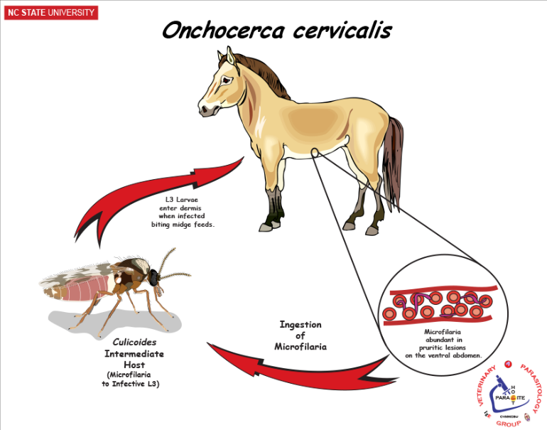 • في حين أن الديدان البالغة الانكوسيركا الرَّقَبِيَّة ( cervicalis) قد تسبب التهاب في الرباط العنقي (nuchal ligament).
