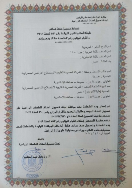 وافقت لجنة تسجيل الأصناف الزراعية برئاسة الدكتور عادل عبدالعظيم رئيس مركز البحوث الزراعية، التابعة لوزارة الزراعة علي تسجيل الصنف جوبا 1800 والمسجل بوزارة الزراعة منذ عام 2022 وبالحماية الفكرية وذلك بعد نجاح الفريق الإستشارى بالمصرية الخليجية لإستصلاح الأراضى الصحراوية برئاسة الدكتور مجدى ملوك من تطوير هذه الصنف لتحقيق أعلي عائد إستثماري وإنتاجي من البذور والزيوت.