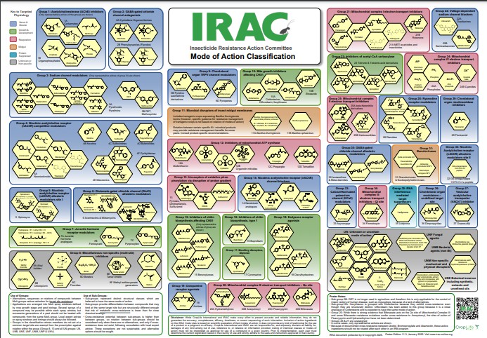 – الدور: IRAC هي منظمة عالمية تُعنى بإدارة مقاومة الحشرات للمبيدات الحشرية. تقوم بتصنيف المبيدات الحشرية إلى مجموعات بناءً على طريقة عملها (Mode of Action) لتسهيل تناوب المبيدات وتقليل المقاومة.