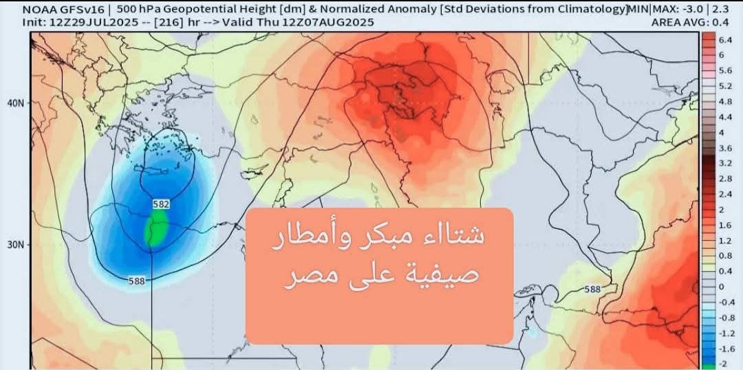 هذا والصورة المعروضة هي خريطة من نموذج الطقس الأمريكي NOAA GFSv16 تظهر انحراف الضغط الجوي على طبقة 500 hPa عن المعدلات المناخية المعتادة (أي الانحراف عن القيم الطبيعية لهذه الفترة) ليوم 7 أغسطس 2025.