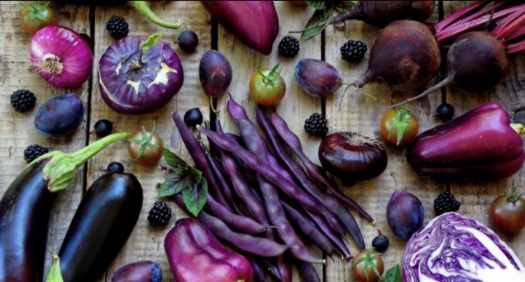 تستمد الأطعمة البنفسجية أو الزرقاء مثل الباذنجان الأرجواني والتوت الأزرق والعنب الأرجواني والبرقوق لونها من الصبغات التي تعمل كمضادات للأكسدة قوية، وخاصةً الأنثوسيانين، التي لاتقتصر وظيفتها على إنتاج اللون فحسب بل تدعم وظائف الدماغ، وتحمي من التدهور المعرفي، وقد تبطئ عملية الشيخوخة، وتحسن وظائف المخ، تعزز صحة القلب وتقلل الإلتهابات فى الجسم، كما تعزز جهاز المناعة، وتساعد أيضًا في حماية الجلد من الأضرار البيئية.