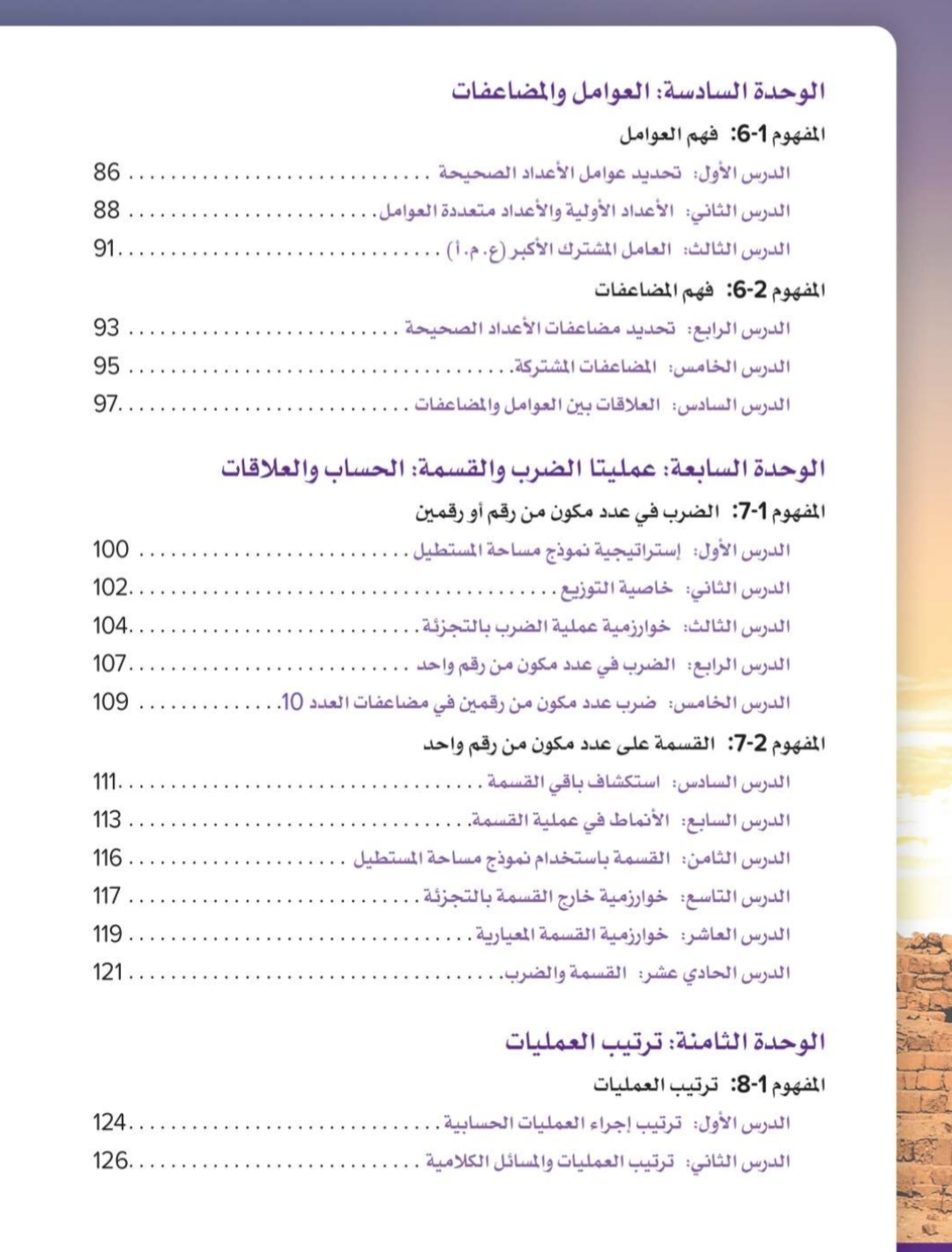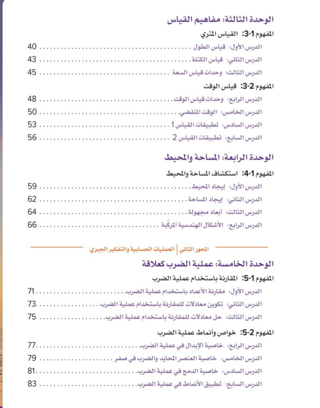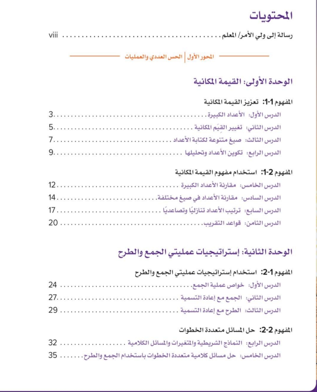 يشتمل منهج رياضيات الصف الرابع الابتدائي على 8 وحدات رئيسية تهدف إلى تنمية المهارات الحسابية والتطبيقية لدى الطلاب، ويمكن الاطلاع على المنهج من خلال الصور التالية: