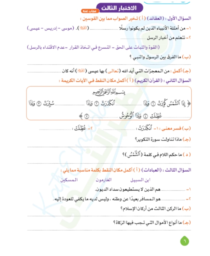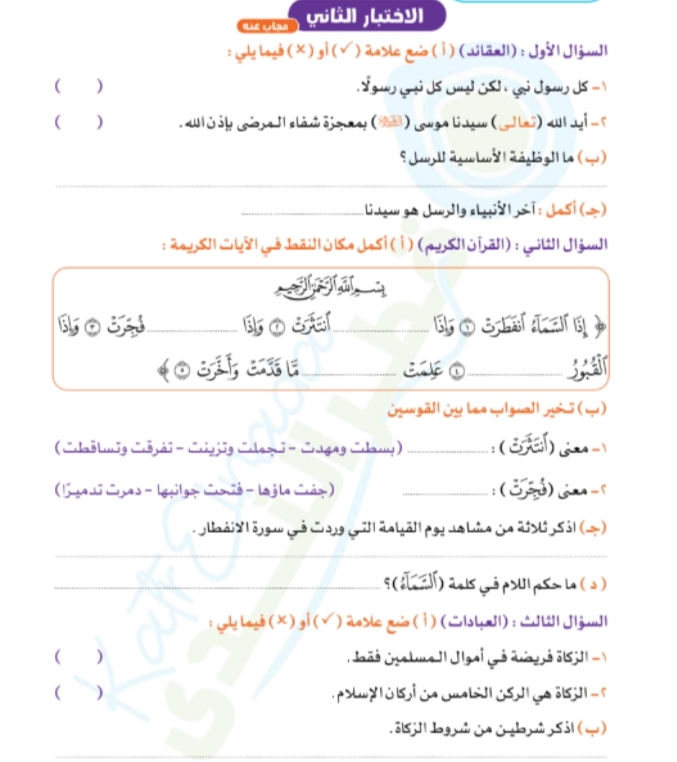 نماذج امتحانات دين للصف الرابع الابتدائي الترم الأول 2026