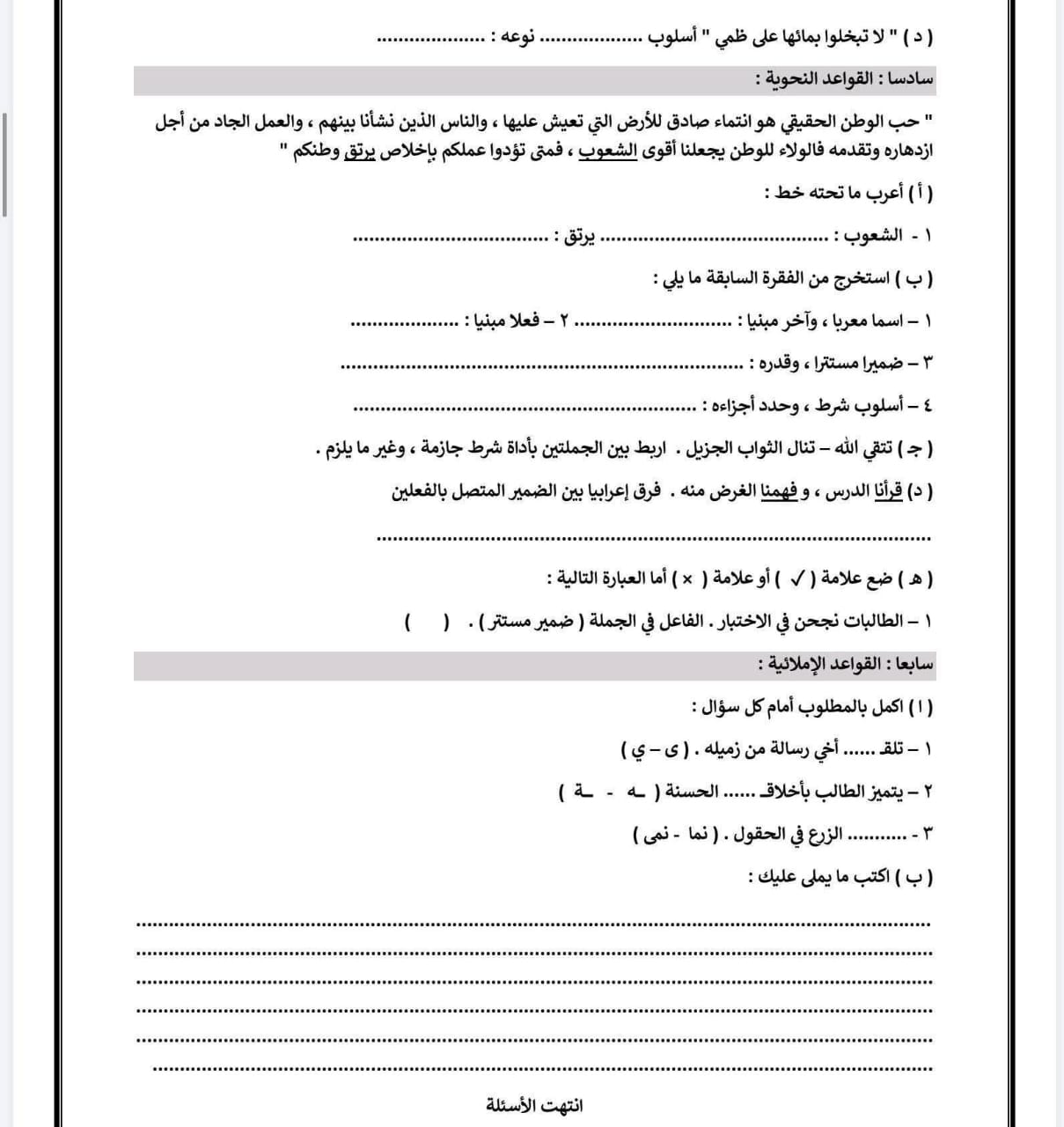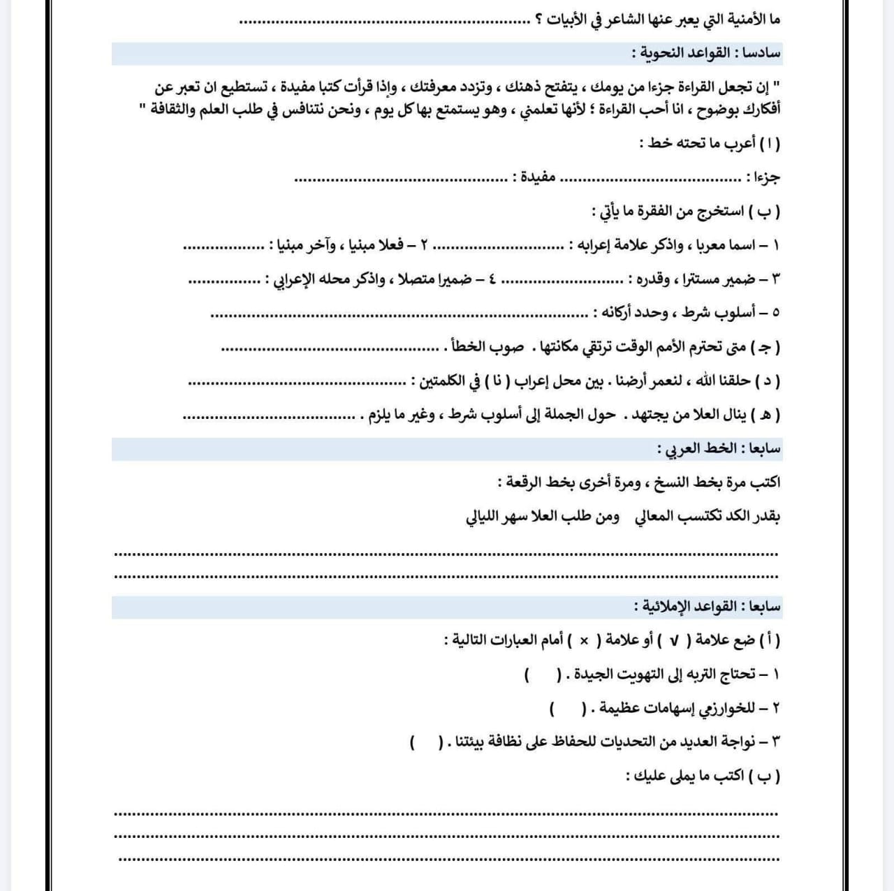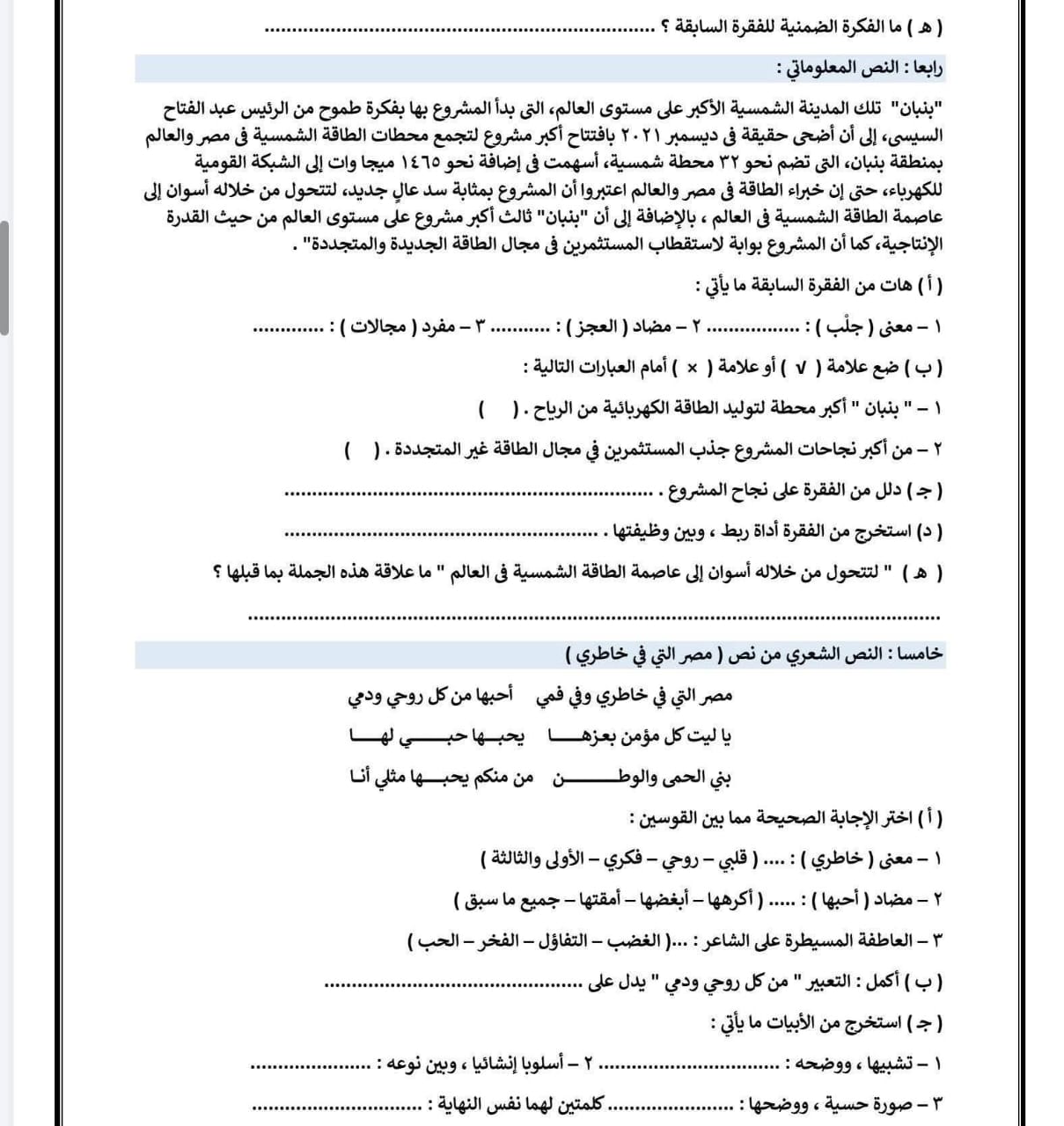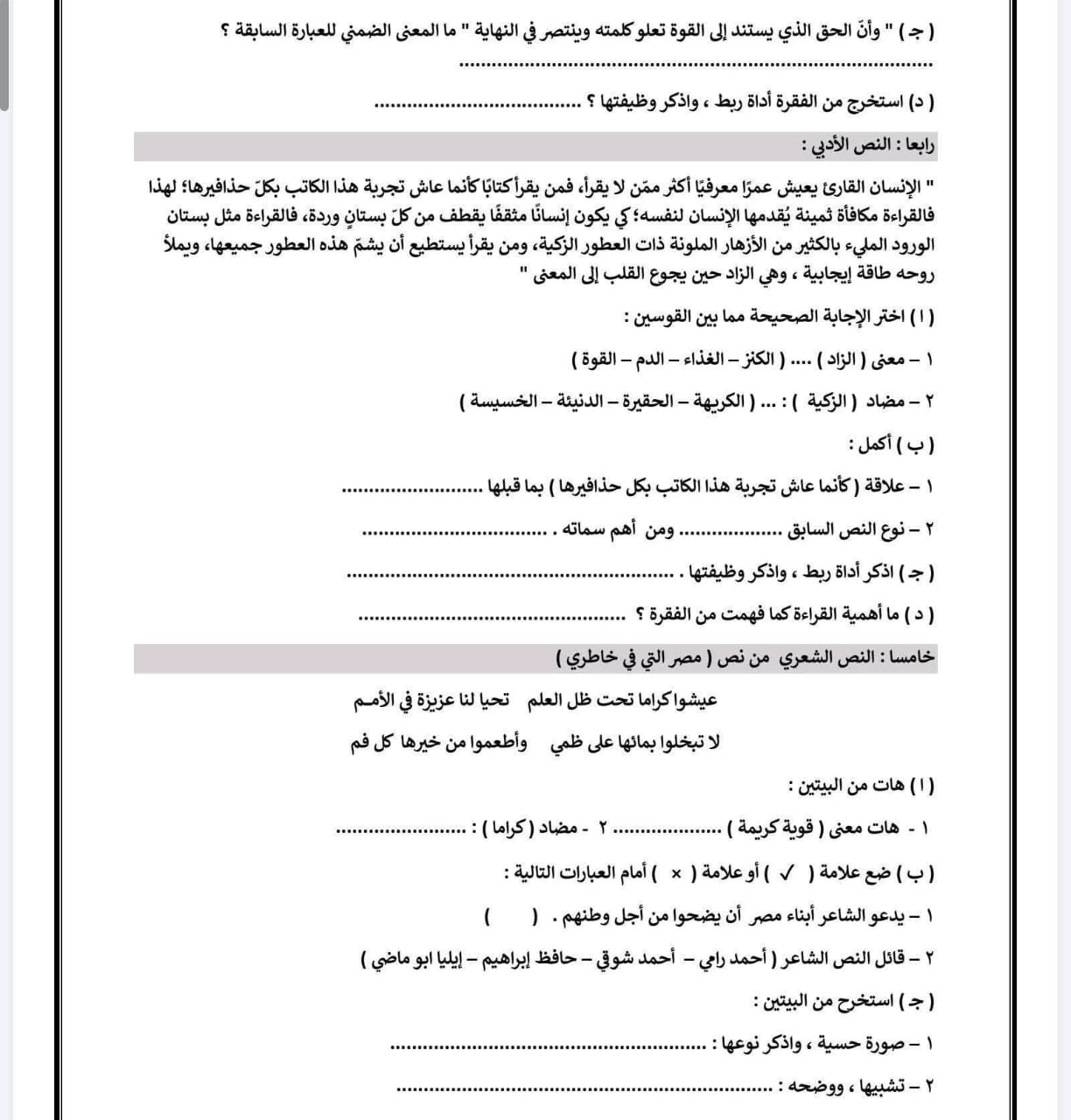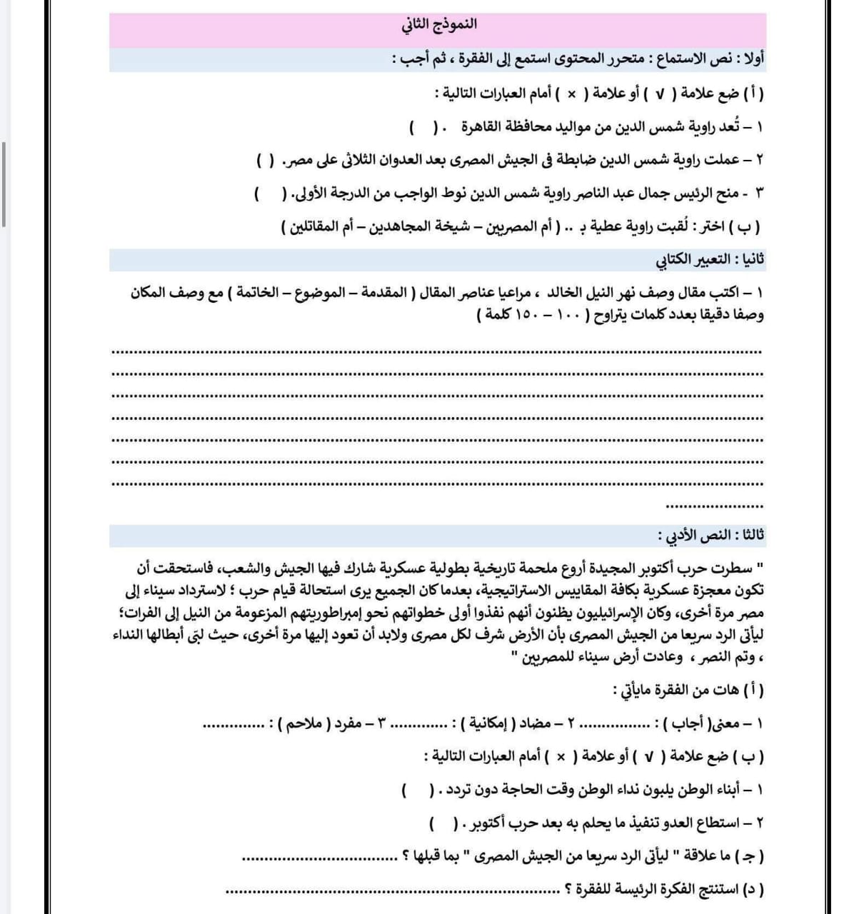 نموذج امتحان عربي للصف الثاني الاعدادي 2026