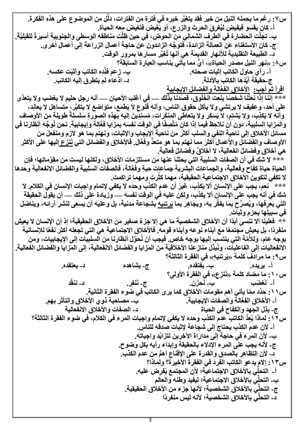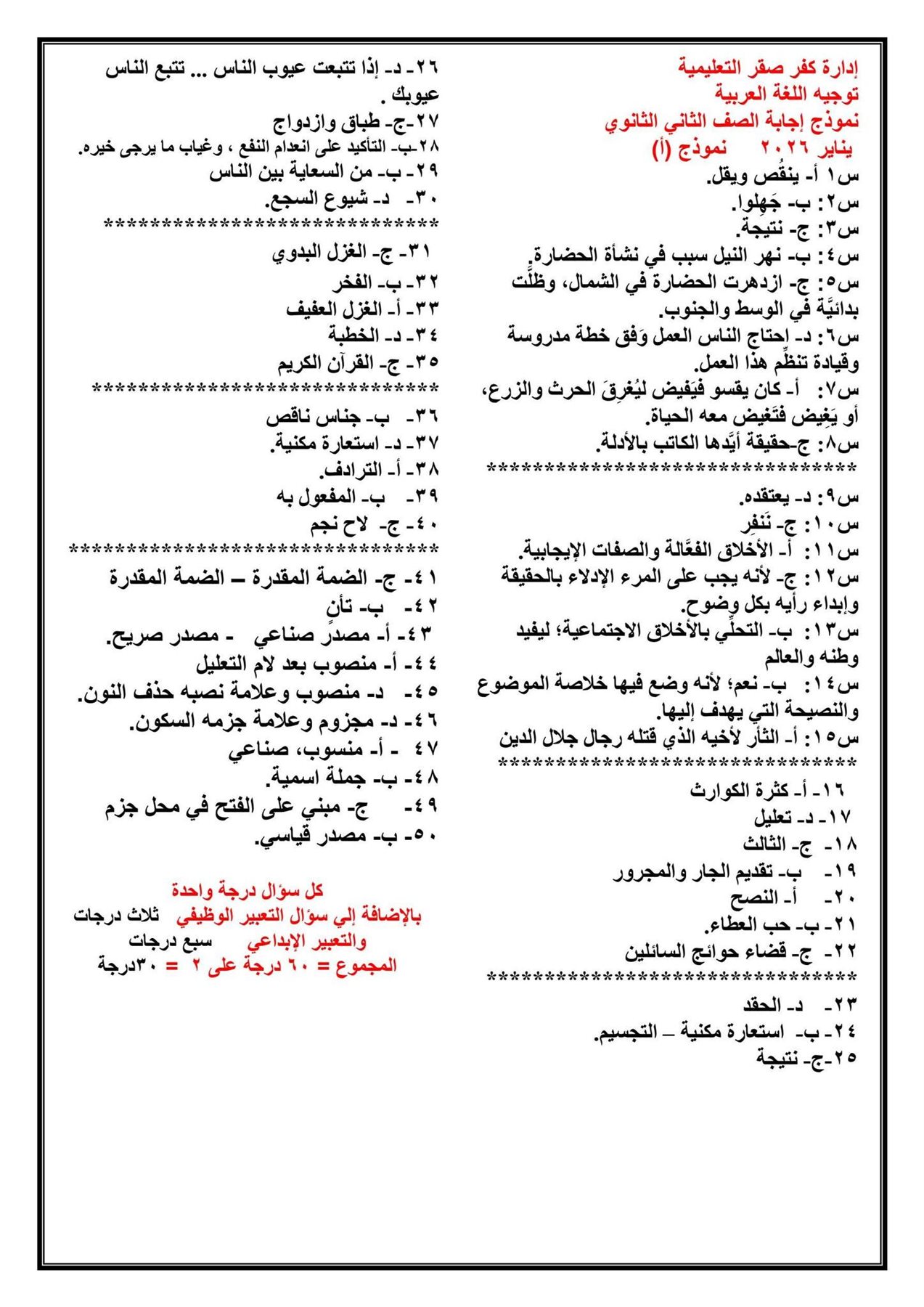 نموذج اجابة امتحان العربي اولى ثانوي 2026