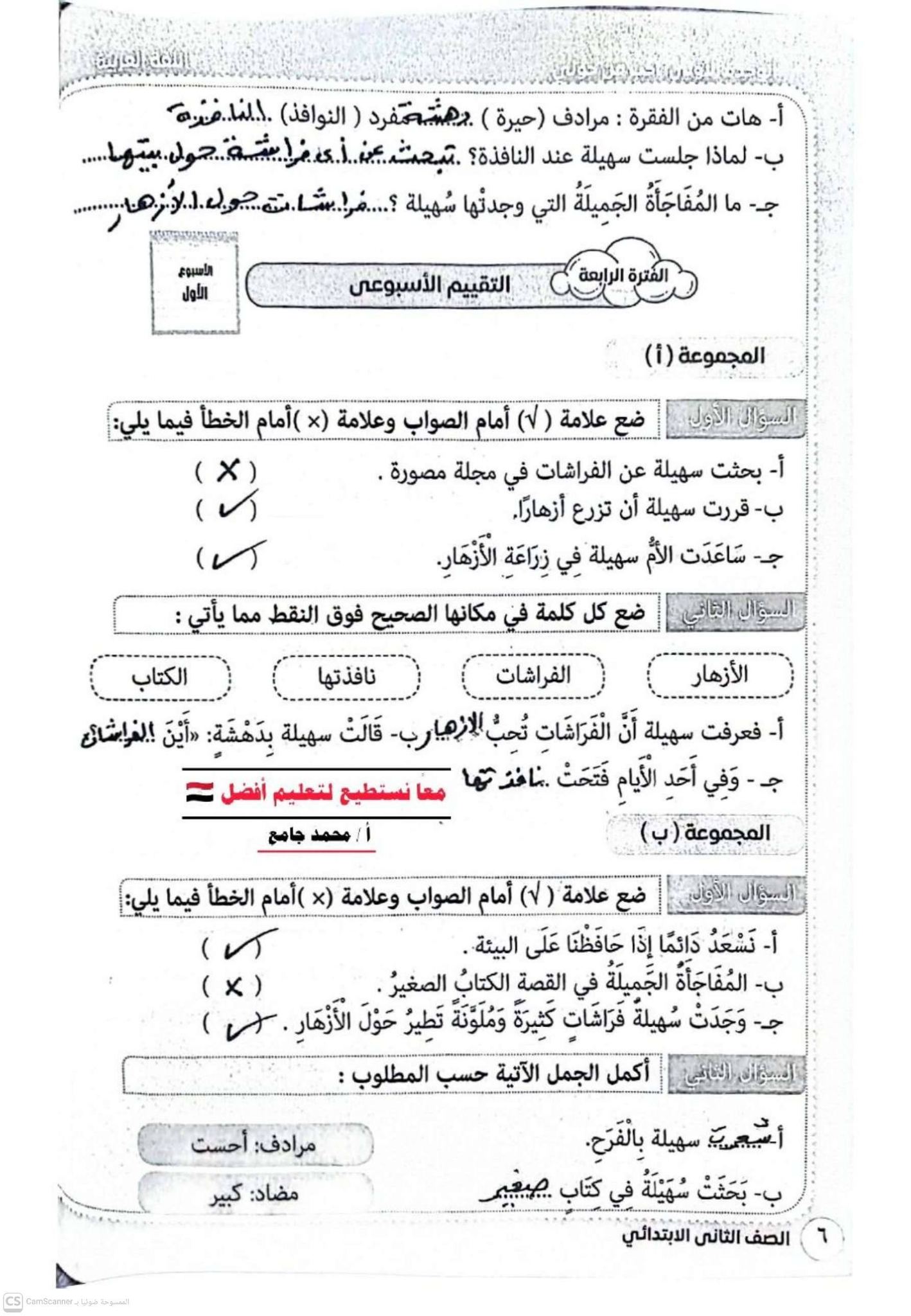 حل تقييم اللغة العربية للصف الثاني الابتدائي 2026 الأسبوع الأولو الثاني