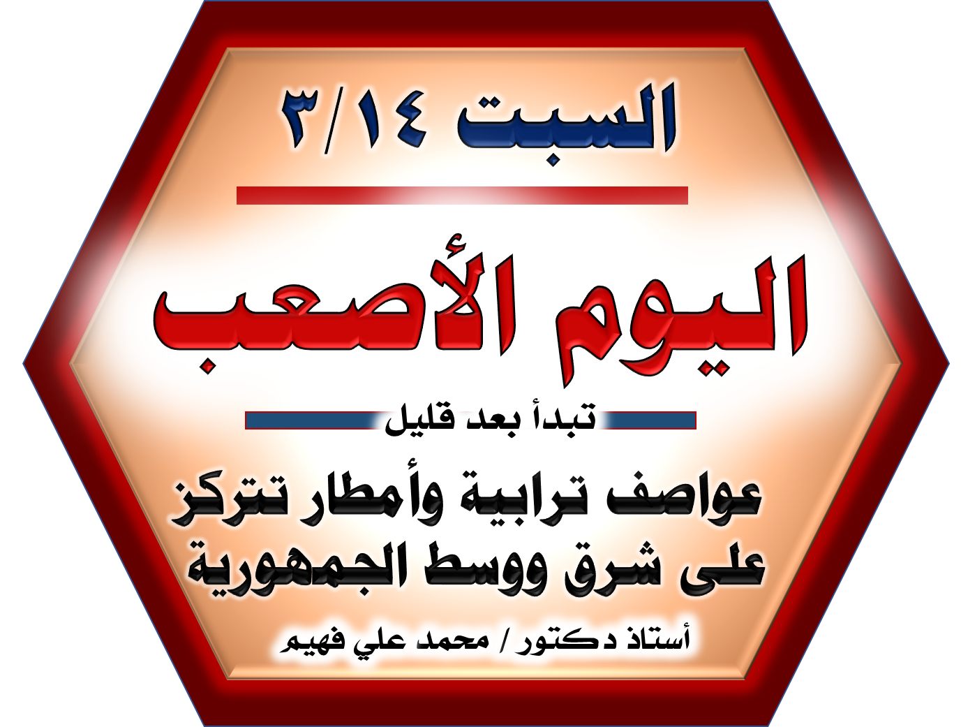 وأشار «فهيم» الي سقوط أمطار متفاوتة الشدة قد تمتد إلى الدلتا ومناطق من القاهرة وتكون مركزة بشكل واضح على مصر الوسطى خاصة في المنيا و بني سويف ومناطق خليج السويس مشيرا إلي أن أخطر الظواهر المتوقعة هي هبوب رياح خماسينية محملة بالأتربة والآمال وانخفاض شديد في الرؤية الأفقية وأمطار قد تكون غزيرة في بعض المناطق واستمرار ارتفاع الحرارة نهارا واضطراب شديد في الملاحة البحرية على البحرين الأحمر والمتوسط.