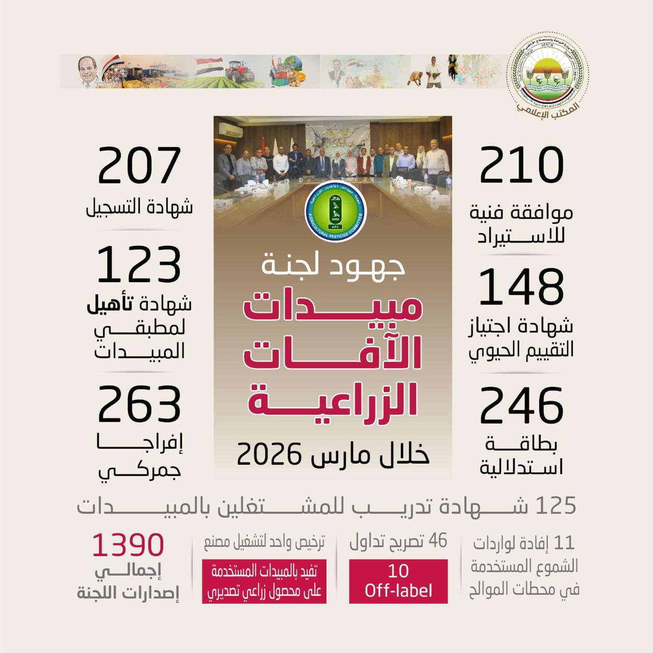 استعرضت وزارة الزراعة واستصلاح الأراضي جهود لجنة مبيدات الآفات الزراعية خلال شهر مارس، مؤكدة استمرار العمل بوتيرة مكثفة لدعم القطاع الزراعي وتعزيز منظومة تداول واستخدام المبيدات وفقًا لأعلى معايير الجودة والأمان، بما يسهم في حماية الإنتاج الزراعي وتحقيق الأمن الغذائي.